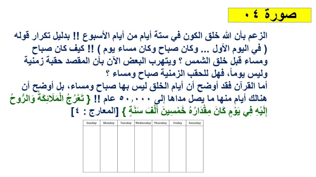 1- ستجدون في سفر التكوين العجب العجاب، مكتوب أن الله خلق السماوات والأرض في اليوم الأول وهو يوم الأحد، ثم خلق الله الشمس في اليوم الرابع وهو يوم الأربعاء، فقولوا لي بالله عليكم كيف يكون هناك أيام الأحد والاثنين والثلاثاء والأربعاء قبل وجود الشمس ؟؟!!؟؟