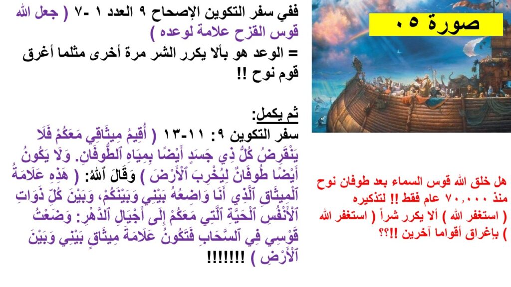 2- أيضاً في مكتوب أن الله بعدما أغرق قوم نوح الفاسقين، ندم على الشر ( !! ) الذي ارتكبه، فخلق قوس قزح لتذكيره ( !! ) بعدم تكرار هذا الفعل الشنيع !!