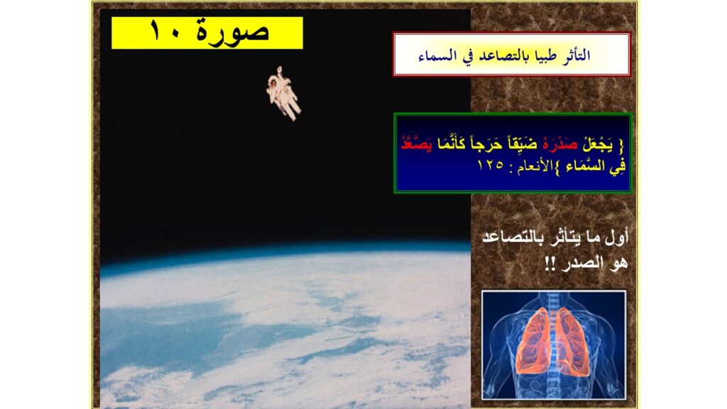 1- نجد آية تخبرنا أن من يتصاعدون في السماء ( !! ) يشعرون بضيق صدر شديد، ثم نكتشف أنه بالفعل كلما ارتفعنا في الجو يتناقص الهواء وما به من أكسجين وضغط، فأول ما يصيب الإنسان ضيق في التنفس لعدم كفاية الأكسجين حيث يشعر الإنسان كأن صدره أصبح ضيقاً لا يكفيه، الغريب ليس احتواء الآية على حقيقتين علميتين، حقيقة فلكية بأن الارتفاع في السماء ينقص فيه الهواء وحقيقة طبية أن الارتفاع في السماء أول ما يتأثر به هو الصدر الذي به رئتين لاستخلاص الأكسجين وقفص صدري يتأثر بقلة الضغط الخارجي