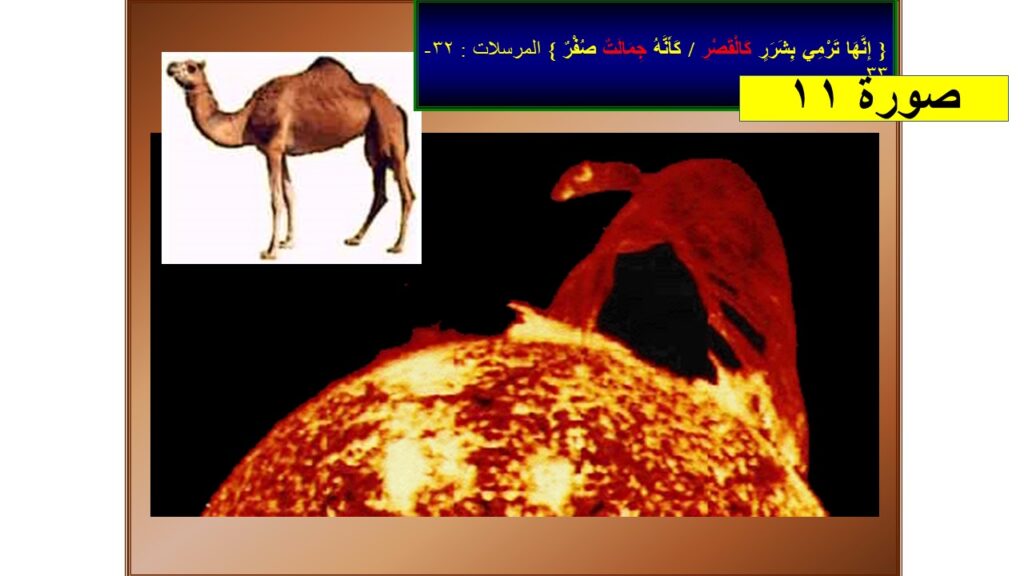 2- تم إطلاق سفينة الفضاء Sky Lab عام 1973 لعمل أبحاثاً في الفصاء بعيداً عن الجاذبية الأرضية + التقاط صور من فوق الغلاف الجوي لتكون أنقى وذلك بتفادي مؤثرات الغلاف الجوي بسبب الغبار والأتربة والضباب فإذا بهم يلتقطون صورة لشرر شديد الضخامة يبلغ حجمه 40.000 كرة أرضية وذلك من فرط ضخامته، ويشبه تماماً شكل حيوان الجمل، والمذهل ويا للعجب أنه موصوف في القرآن الحكيم منذ 1.444 عام !! كيف ذلك ؟ ( الصورة مرفقة ) ( سورة المرسلات الآية 32-33 )
