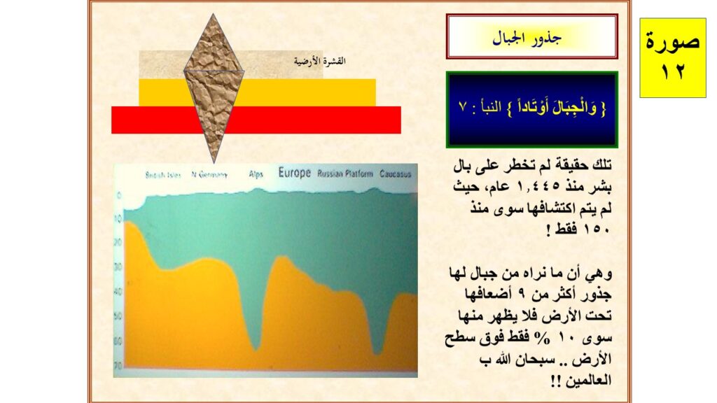 3- وفي مجال الجيولوحيا نجد آية من كلمتين فقط تشير إلى أن ما نراه من جبال هي مجرد قممها فقط حيث أن الجبال لها جذوراً وأوتادأً، وذلك بالفعل ما اكتشفناه في هذا العصر فقط !! هل يعقل ذلك ؟ هل يعقل أن النبي محمد هو الذي قام بتأليف القرآن ؟ أم أن هذا الكلام نزل عليه من خارج كوكب الأرض !؟ ( سورة النبأ الآية 7 )