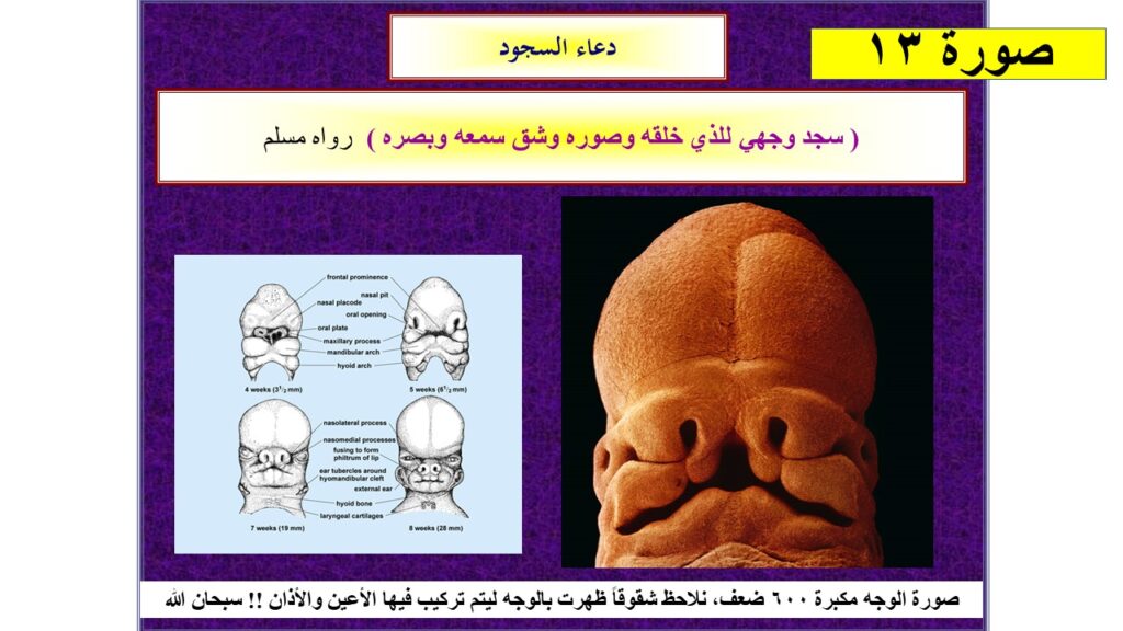 4- وفي مجال الأجنة يذكر سيدنا محمد في الحديث الشريف أن هنالك شقوقاً تحدث في وجه الجنين ليتم تركيب الأعين والأذن بهم، وهذا بالفعل ما اكتشفناه بعد تكبير صورة وجه لجنين عمره 3 أسابيع عن طريق ميكروسكوب مجهري، حيث قام بتكبير الصورة لـ 600 ضعف، ولأول مرة نرى وجه الجنين داخل رحم أمه حيث التقط تلك الصورة البروفيسور لينارد نلسون في السويد عام 1976 ، فكيف عرف النبي محمد ؟