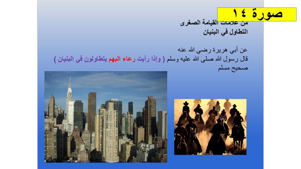 5- كما أنبأنا رسول الله أن واحدة من علامات يوم القيامة أن يتطاول الناس في البنيان، فإذا بنا نرى تسابقاً محموماً من أجل التفاخر في تشييد ناطحات السحاب بدأ في الولايات المتحدة الأمريكية ثم أغلب المدن الرئيسية حول العالم حتى انتقل إلى دول الخليج العربي !! ( في آخر الزمان عندما يتطاولون في البنيان )