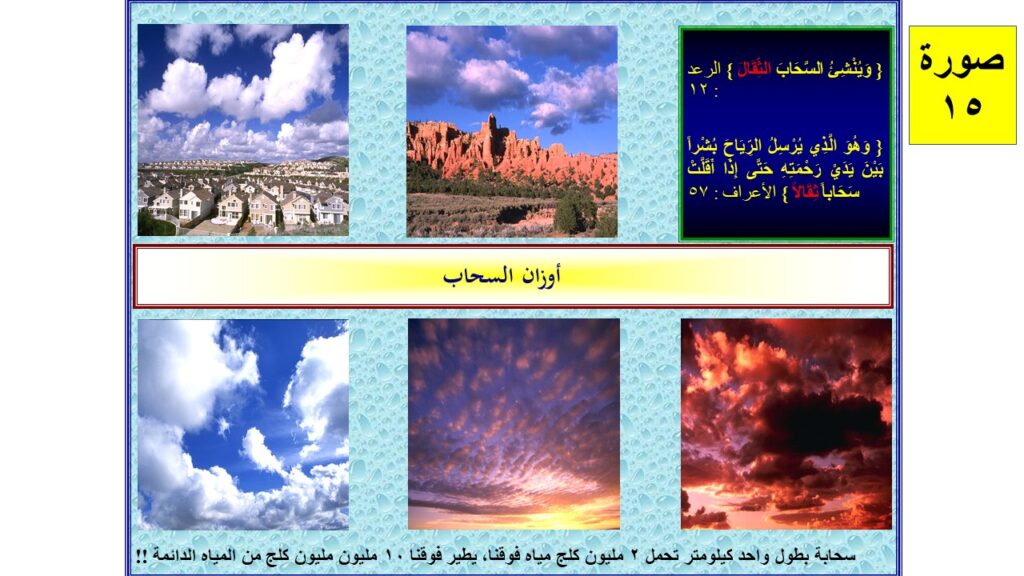7 – أيضاً أشار القرآن الحكيم أن السحاب ثقيل !! وكلنا نعتقد أن السحاب خفيف، حتى أفادنا علماء المناخ أن سحابة طولها 2 كيلومتر تحمل ماء يناهز وزن 10 مليون كلج !! وأن السحاب الذي يطير فوقنا في الغلاف الجوي يزن إجمالاً 10 تريليون كلج !! فمن كان يجرؤ في الماضي أن يقول أن السحاب ثقيل !! إلا إذا كانت تلك الآيات موجهة إلينا نحن الآن في عصر العلم لنتأكد أن القرآن من خارج كوكب الأرض .. ( سورة الأعراف 57 + الرعد 12 )