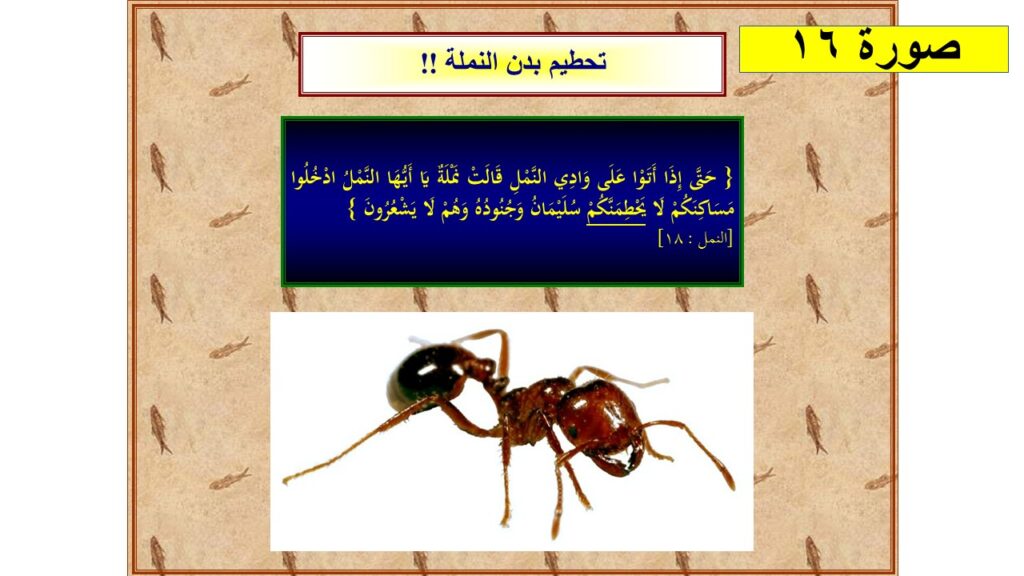 8- في مجال الحيوانات القرآن الكريم أشار إلى أن النمل يتحدث، وإذا بنا نكتشف أن النمل يتمتع بأفضل وسائل التواصل حيث يتفاهمون بثلاثة طرق وهي التحدث المباشر وقد سجلنا ذبذباتهم، أيضاً يتقاهمون بالإيماءات، وايضاً يتفاهمون بترك مخلفات كيميائية خلفهم تدل على معلومات محددة متفاهم عليها بينهم !!! ( سورة النمل الآية 18 )